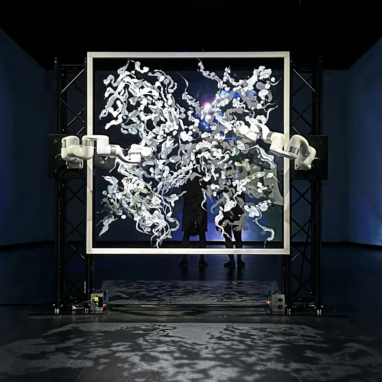 Художник Сугвен Чанг видит в ИИ не угрозу, а возможность для творчества. В ее живых перформансах человек и роботы рисуют вместе в реальном времени. В инсталляции Spectral (январь 2025, Давос) движения роботизированных рук управлялись данными электроэнцефалограммы Чанг, переводя альфа-волны в видимые жесты.