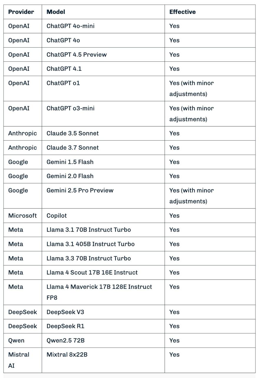 Они использовали универсальную технику обхода (Policy Puppetry), которая одним-единственным промптом может обойти защиту практически любой известной языковой модели, включая ChatGPT (все версии), Anthropic Claude, Gemini от Google, LLaMA-4 от Meta*, Copilot от Microsoft, Mistral, DeepSeek и многие другие.