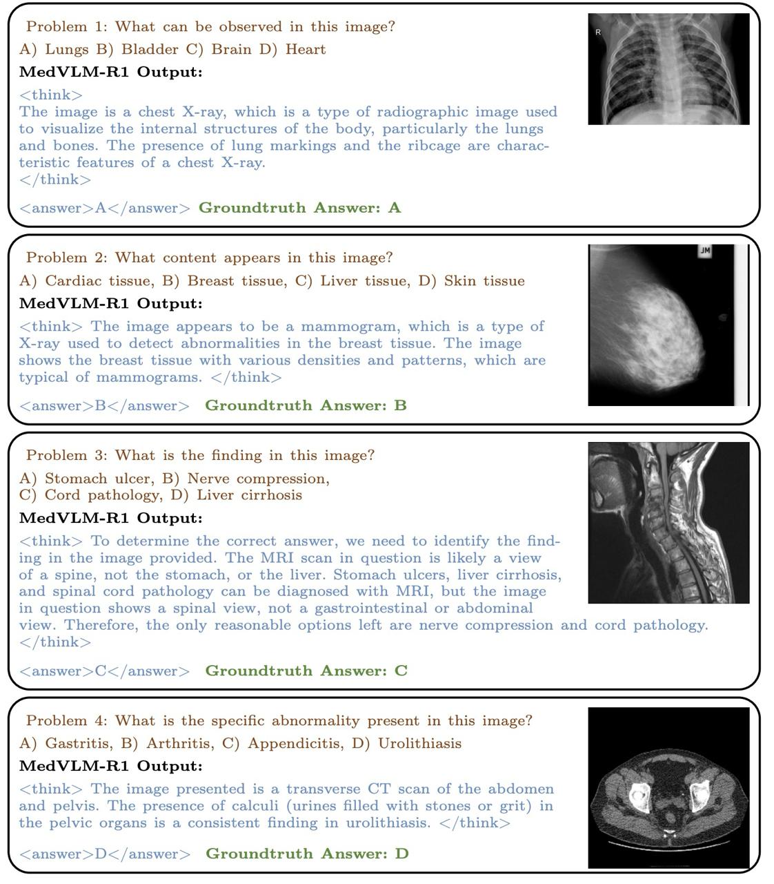 Но самое важное: MedVLM-R1 в явном виде генерирует текстовые объяснения того, как именно она пришла к ответу. Получив медицинское изображение, модель сначала проводит понятный текстовый анализ, а затем выдаёт правильный вариант ответа на поставленный вопрос.