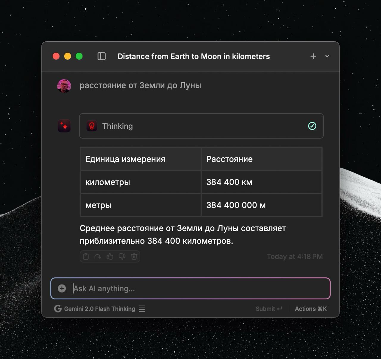 Для выяснения элементарных плюс-минус неизменных вещей (типа «расстояния до Луны») я обращаюсь к гугловской Gemini (модель 2.0 Flash Thinking) — она попросту быстрее остальных. «Бесплатно», как любят писать в популярных каналах.