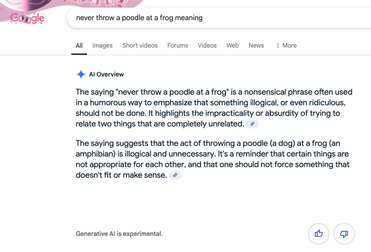 Опубликовано24 апр. 2025 г.#забавно+1«Не бросай пуделя в свинью»значение фразы «never throw a poodle at a pig» в ответах Google AI